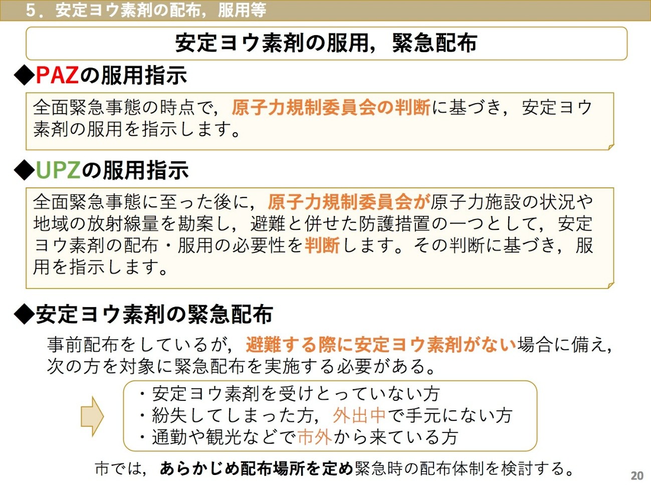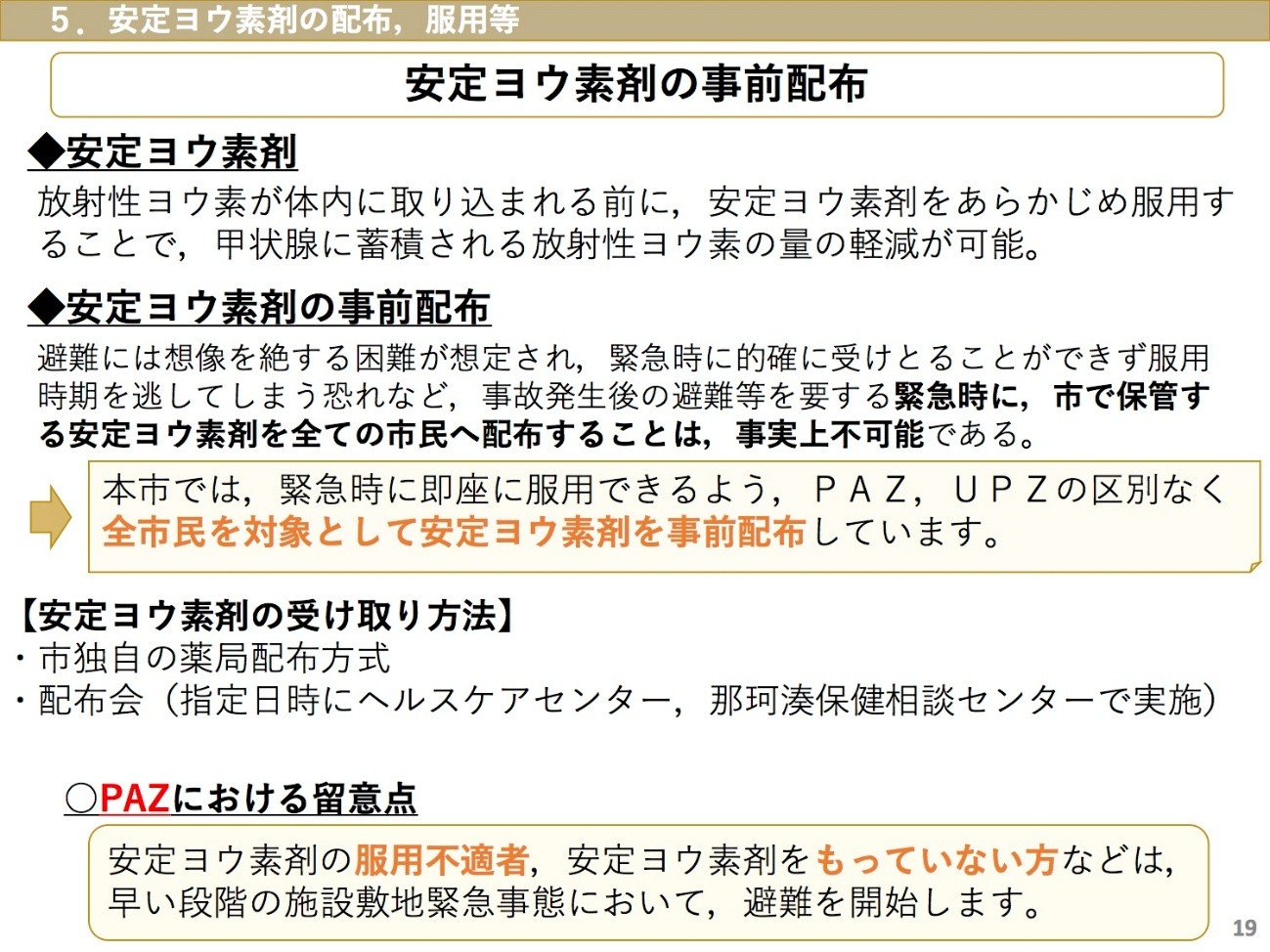 - 2016.11月~ ゼリー剤配布開始(3歳未満)。また、2017.8.5~ ヨウ素剤更新説明会(3年毎)開始