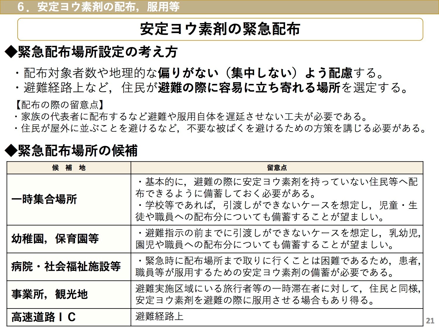 - 2013年6月 原子力規制庁は、福島第一原発事故の教訓を踏まえ、 安定ヨウ素剤を事前配布する方針へ