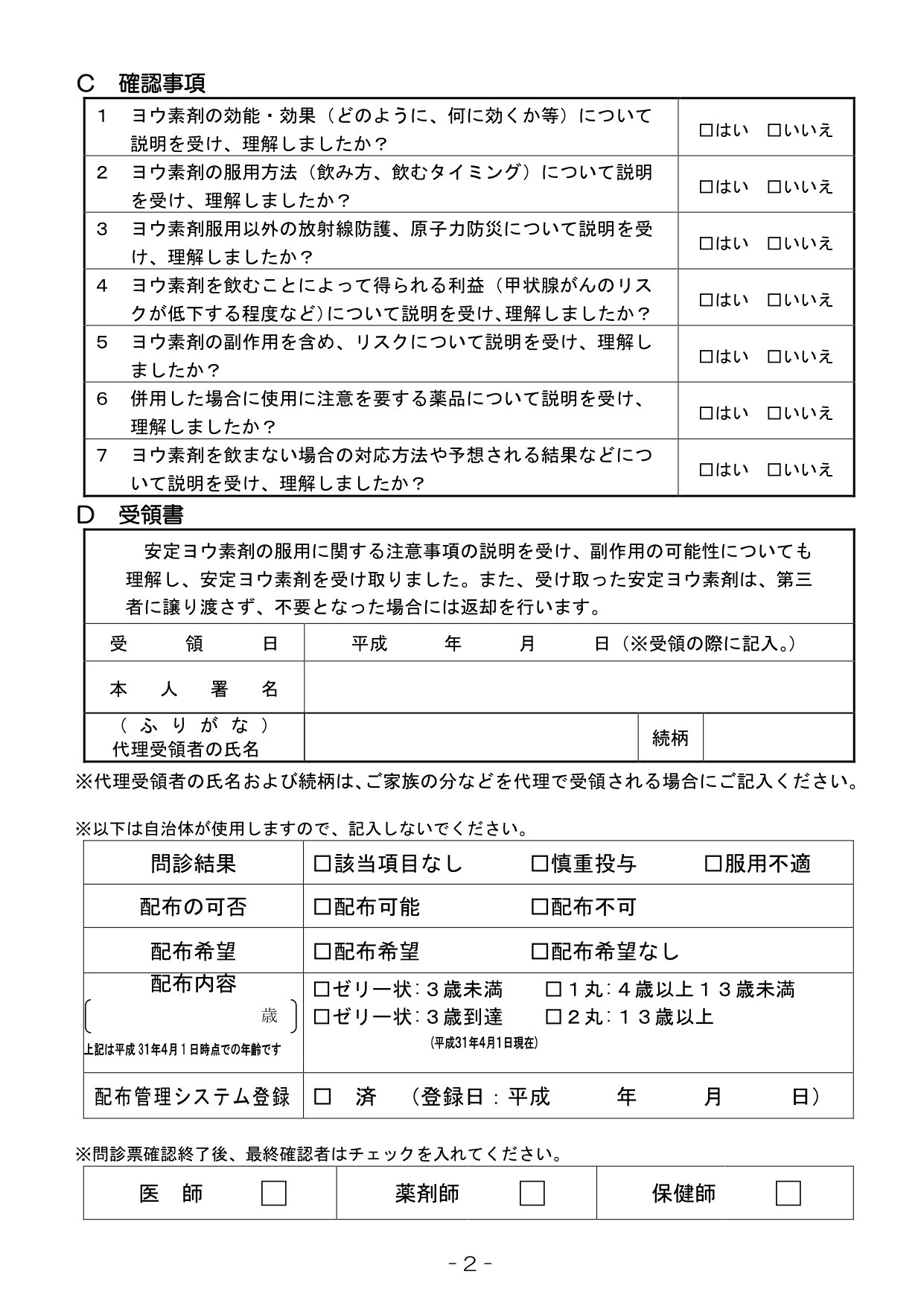 - 2016.11月~ ゼリー剤配布開始(3歳未満)。また、2017.8.5~ ヨウ素剤更新説明会(3年毎)開始